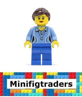 31026 Medium Blue Female Shirt with Two Buttons and Shell Pendant, Blue Legs, Dark Brown Ponytail and Swept Sideways Fringe (twn213), contents have been removed from original packaging and placed into clear zip lock bags.