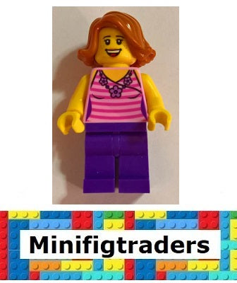 31084 Woman, Striped Pink Shirt with Flower Necklace, Dark Purple Legs, Dark Orange Female Hair Short Swept Sideways (twn330), contents have been removed from original packaging and placed into clear zip lock bags.