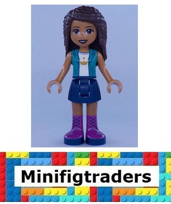 41449 Friends Andrea, Dark Blue Skirt, Dark Turquoise Jacket over White Top with Crown (frnd415), contents have been removed from original packaging and placed into clear zip lock bags.