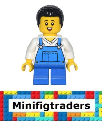 60346 Farmer - Boy, Blue Overalls over V-Neck Shirt, Blue Short Legs, Black Coiled Hair, Freckles and Small Open Smile (cty1443) contents have been removed from original packaging and placed into clear zip lock bags.