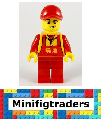 80105 Food Vendor, Red Cap and Apron, Bright Light Orange Logogram '烧烤' (Barbecue) (hol183) contents have been removed from original packaging and placed into clear zip lock bags.