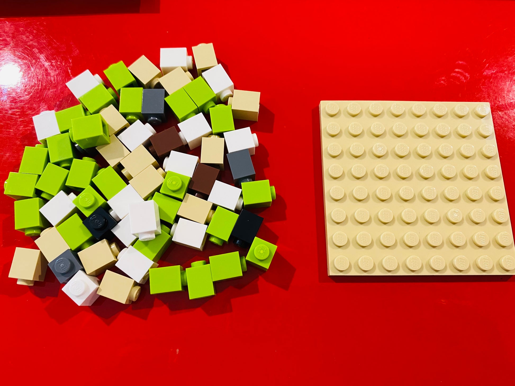Each kit includes a tan coloured base plate, packet of 1x1 bricks of varying colours, Parent/teacher black envelope with solution inside (Not for builders eyes until after the build), 1 tool, 1 set of builder laminated instruction cards.