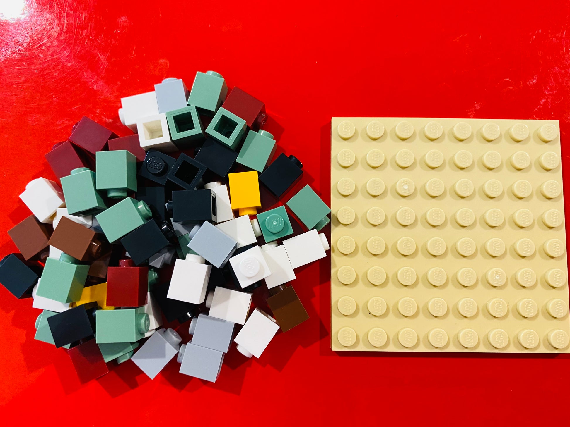 Each kit includes a tan coloured base plate, packet of 1x1 bricks of varying colours, Parent/teacher black envelope with solution inside (Not for builders eyes until after the build), 1 tool, 1 set of builder laminated instruction cards.