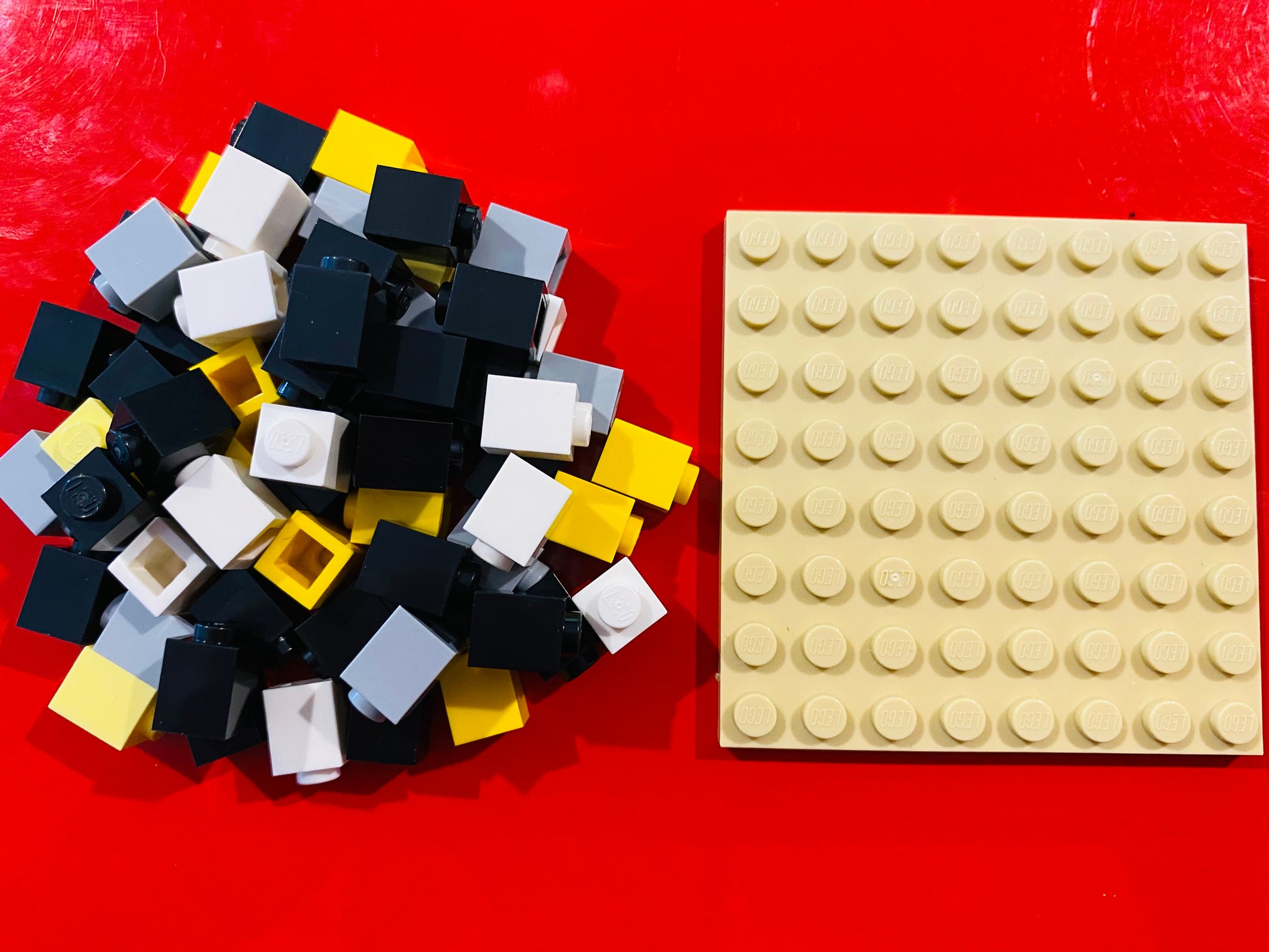 Each kit includes a tan coloured base plate, packet of 1x1 bricks of varying colours, Parent/teacher black envelope with solution inside (Not for builders eyes until after the build), 1 tool, 1 set of builder laminated instruction cards.