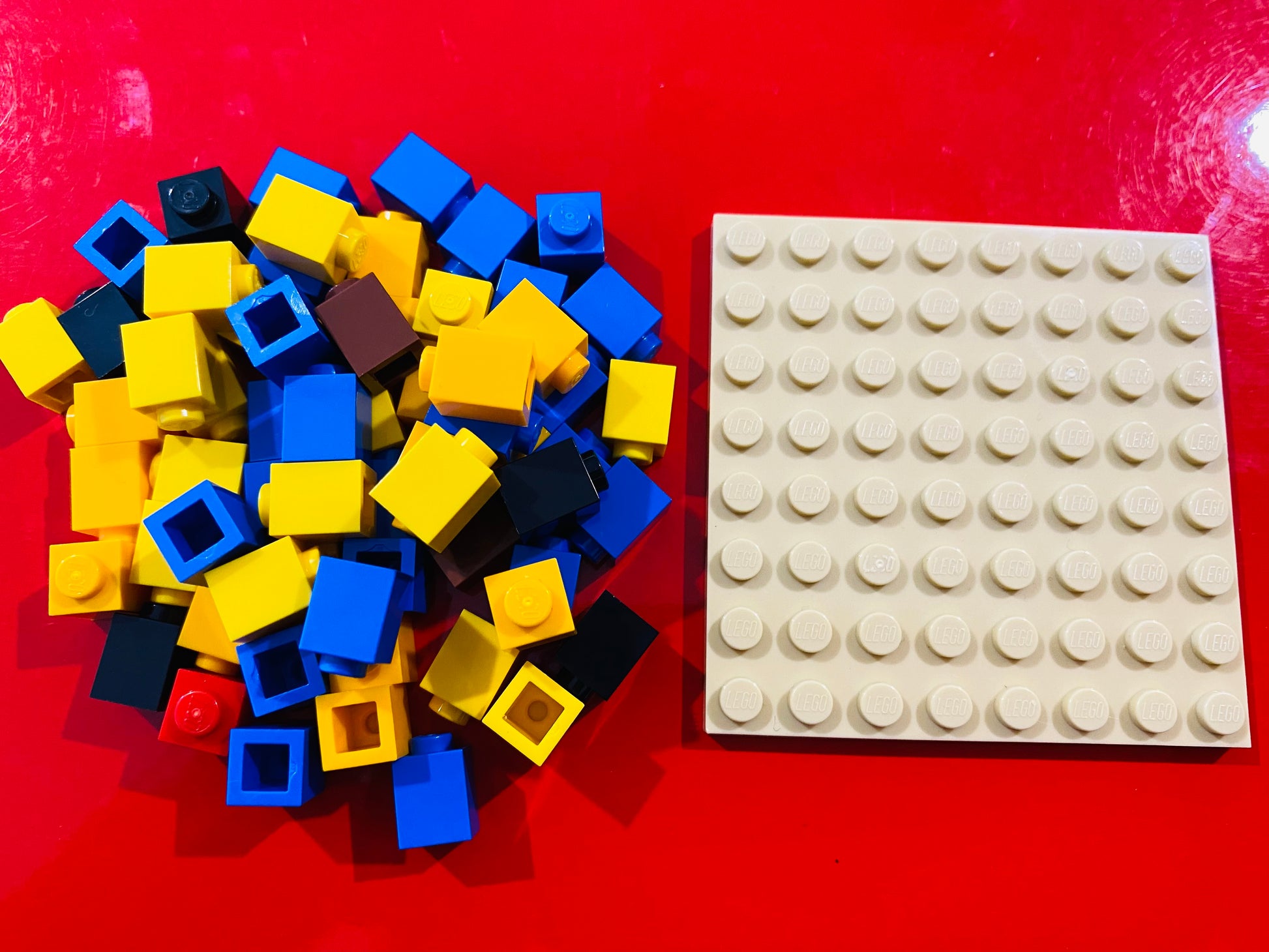 Each kit includes a tan coloured base plate, packet of 1x1 bricks of varying colours, Parent/teacher black envelope with solution inside (Not for builders eyes until after the build), 1 tool, 1 set of builder laminated instruction cards.