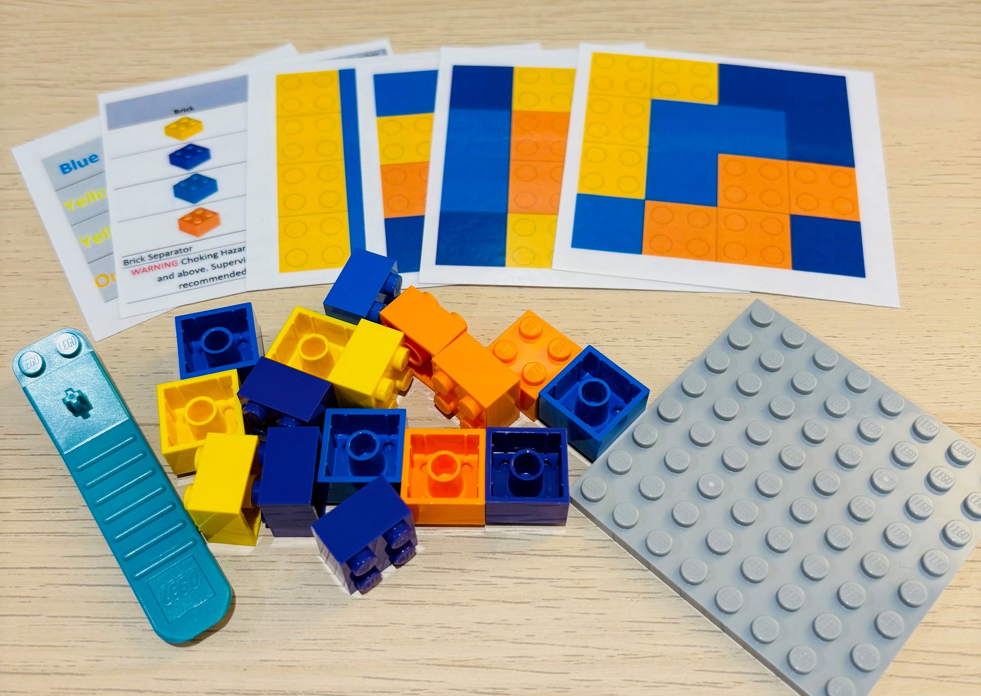 Contents: 1-8 x 8 grey coloured plate; 1-Packet of 2 x 2 bricks of varying colours, 1 x Tool and 6 laminated cards with colour designs to learn colours and patterns.